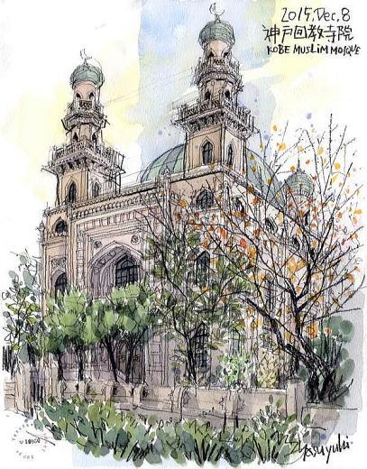 昨年、2015年12月の神戸新聞文化センターのYY街角スケッチ講座は神戸回教寺院を描いた。正式な名は神戸ムスリムモスク。神戸に住んでいたトルコ人、インド人、タタール人が資金を出し合い、チェコ人建築家スワガーの設計で1935年に、日本最初のモスクとして完成した。支那事変勃発前夜の緊迫した社会情勢の中、こういうものが建てられるところが神戸らしい。モスク周辺には、ムスリムの人たちが食べるハラ―ル食品を扱う店が数軒あり、店先を借りてのスケッチ。